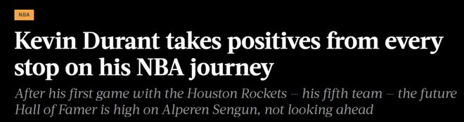 “我不会说那段经历是种挑战。我可是在NBA打球,”杜兰特说,“我当时身体状态依然良好,既能继续打磨球技,也能在比赛中全力以赴。我不会用负面的眼光看待那段经历。能在NBA打球,我任何时候都感到开心。我喜欢在菲尼克斯打球,曾以为自己会在那里退役。现在我也喜欢在休斯顿打球。”