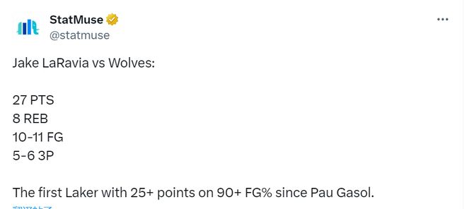 11投10中,三分球6投5中,罚球5中2,轰下27分8篮板2助攻1抢断1盖帽,拉拉维亚打出了加盟湖人以来最出色的一战,也帮助湖人以116比115击败森林狼,取得球队新赛季第三场胜利。湖人目前战绩3胜2负,在饱受伤病困扰的情况下取得这样的成绩已经很难得。