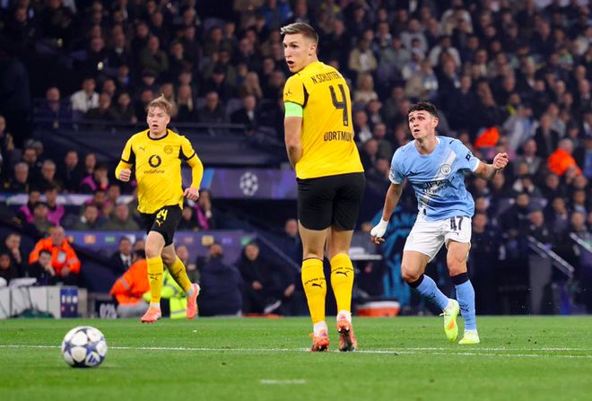 第22分钟,曼城看似在多特蒙德的半场漫不经心传球,福登突然起脚远射,皮球直接钻进死角。