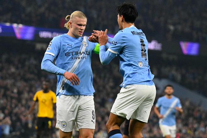 第27分钟,曼城继续在前场围攻,多库下底传中,哈兰德无人盯防,面对旧主完成进球。