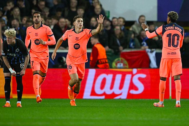 第61分钟,亚马尔打进拍案叫绝的一球,面对布鲁日的包夹,亚马尔如穿花蝴蝶一般突入禁区,费尔明脚后跟助攻,亚马尔扳平比分。